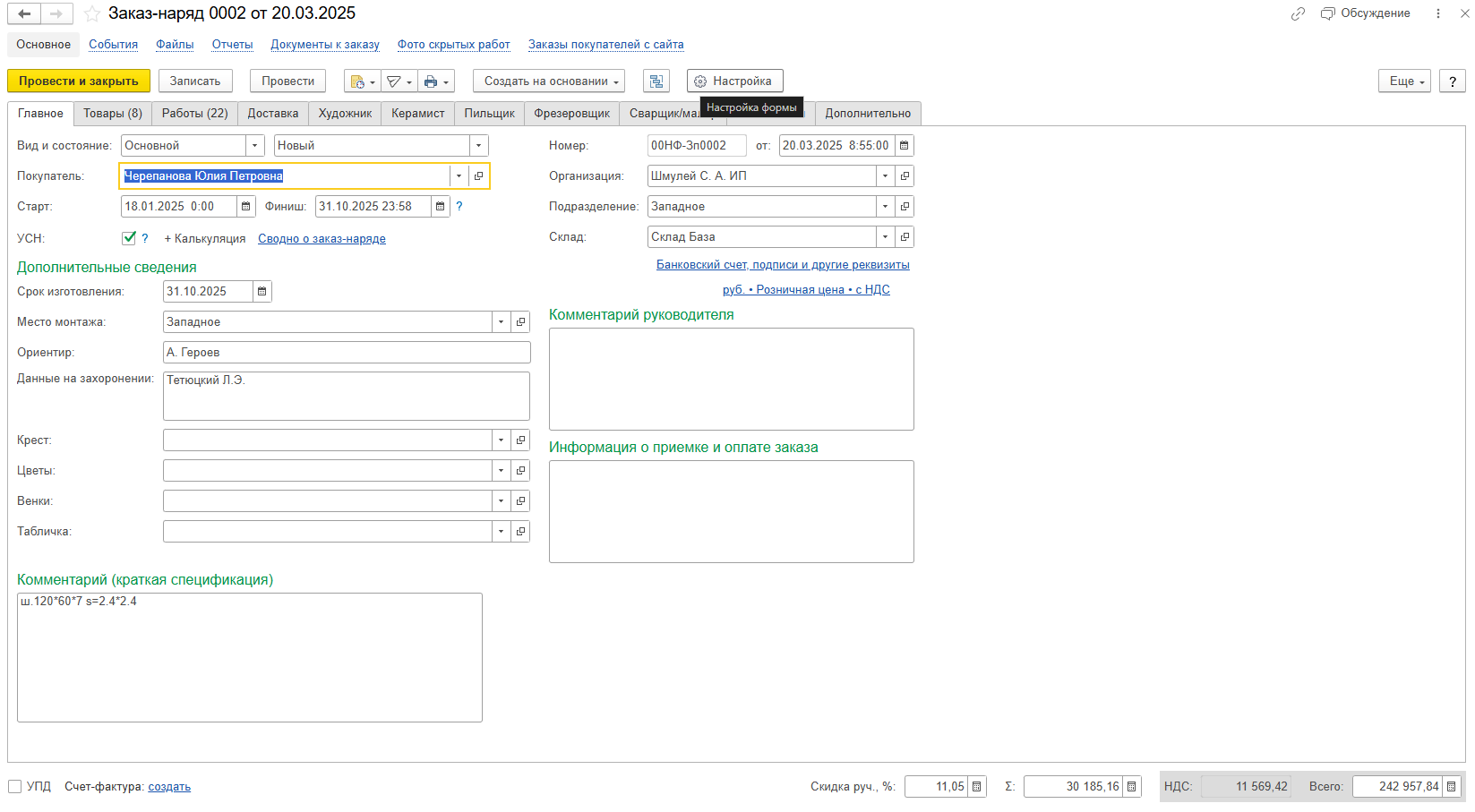 - Комментарий – указывается краткая Спецификация заказа для отображения в списке всех заказ нарядов