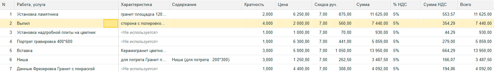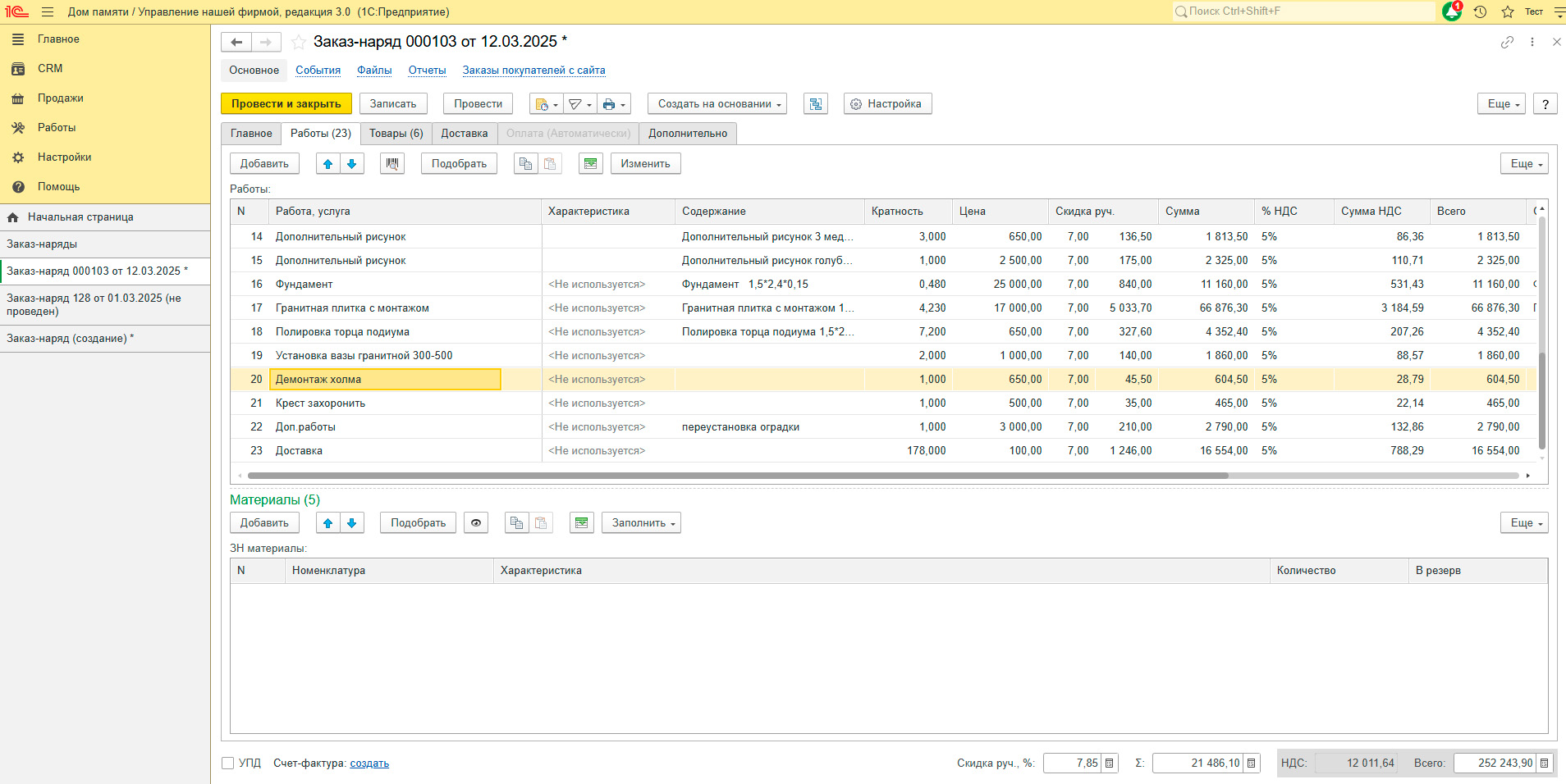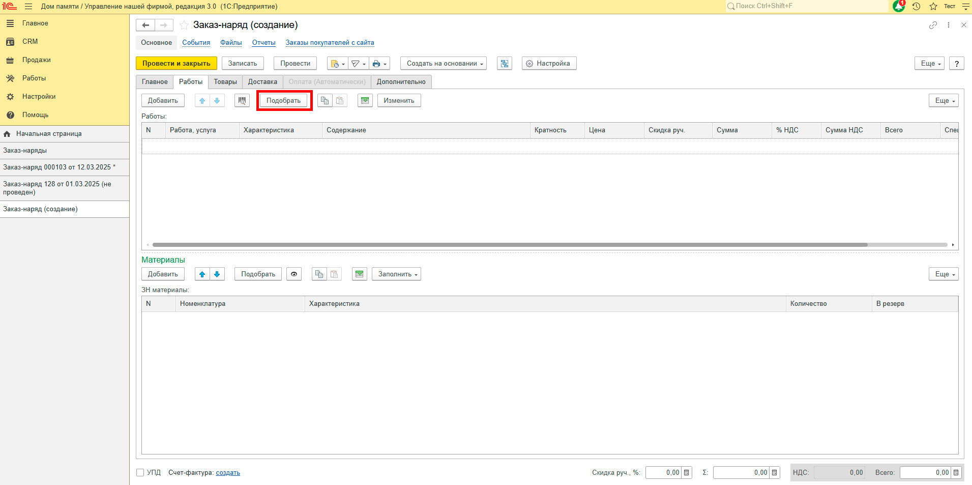 На вкладке “Работы” заполняются только проводимые работы и услуги связанные с заказом: