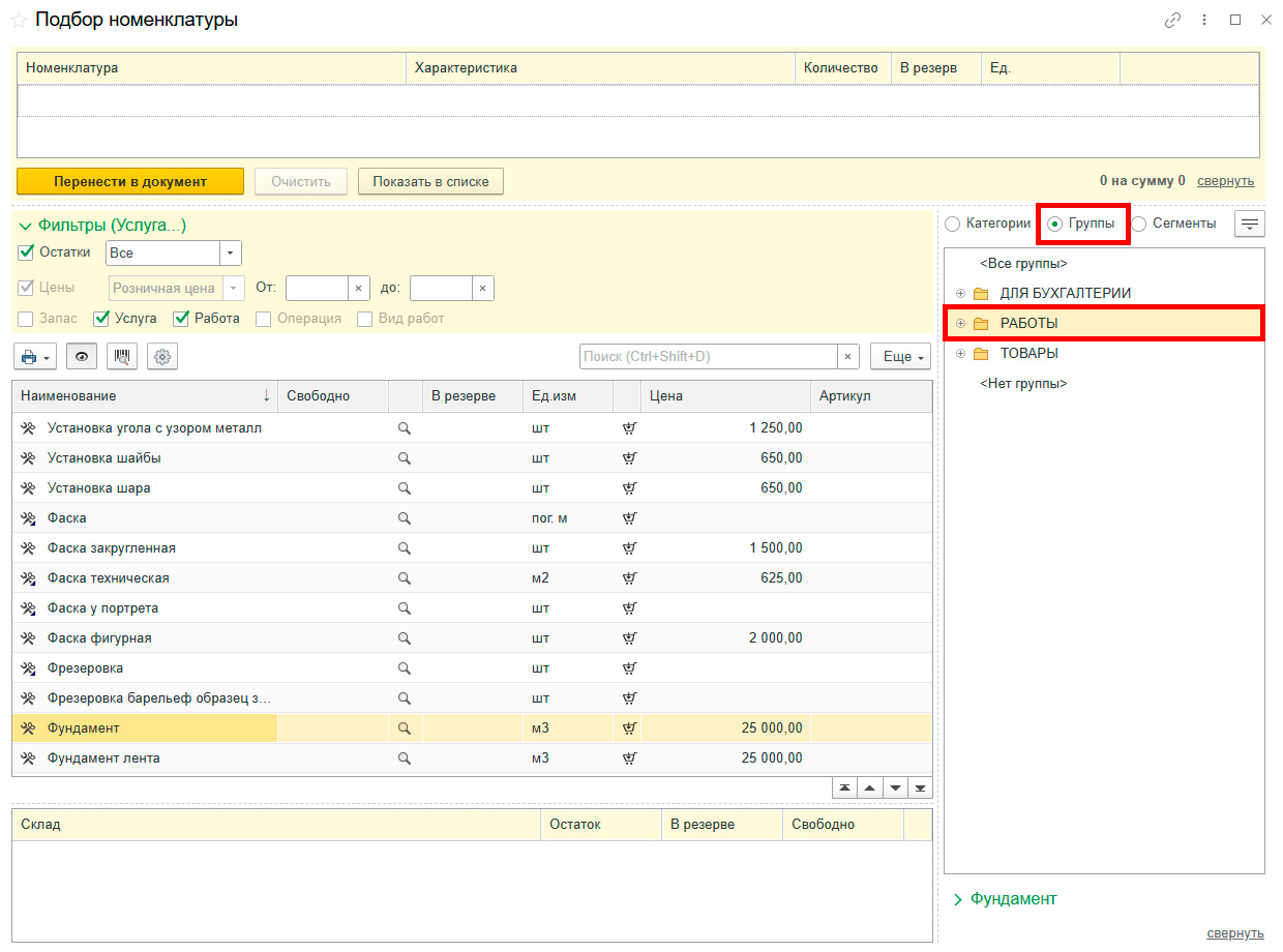 Добавив необходимые работы нажмите кнопку “Перенести в документ“, чтобы добавить их в Заказ-наряд.